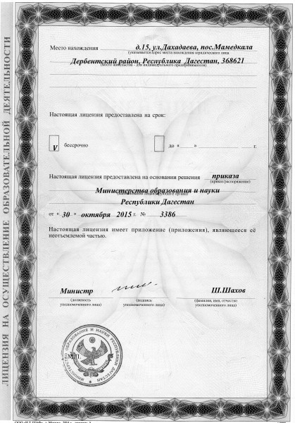 | Адрес местонахождения образовательной организации* | 368621, Республика Дагестан, Дербентский район, поселок Мамедкала, улица Дахадаева, дом 15 |